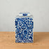 Firkantet hvit krukke med håndmalt blått chinoiserie mønster.