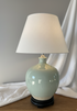 Hvit/grønn keramikk lampefot. Rustikk utførsel. Glasert med grovere natur bunn plassert oppå en sort trefot.