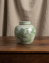 Krukke malt med landskapsmotiv i grønt. Rund i form, og med et lokk.